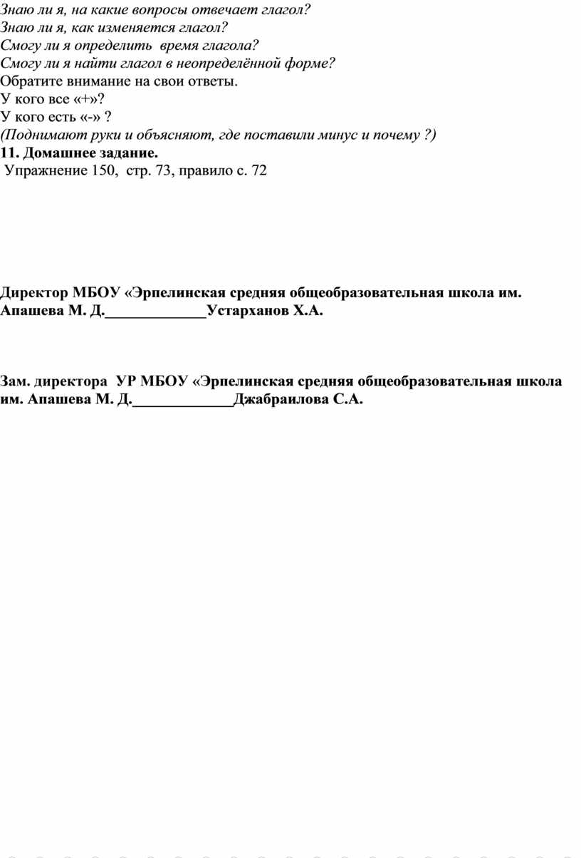 Учащиеся, на уроке были активны, внимательны, работоспособны. Выбранная форма организации учебной деятельности школьников показала себя очень эффективной, т.к темп урока позволил выполнить больший объём заданий. Создание проблемных ситуаций (в самом начале урока) мотивирует учащихся к настрою в работе. Чтобы проверить алгоритм действия нахождения неопределённой формы глагола, детям даны дополнительные задания для индивидуальной работы. На этапе обобщения уч-ся работают в паре, выполняя задание по теме, с обязательным проговариванием вопросов неопределённой формы.