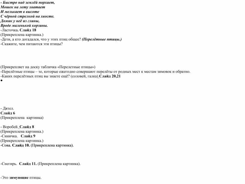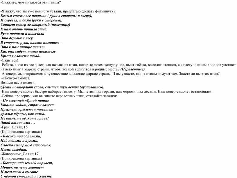 -Я вижу, что вы уже немного устали, предлагаю сделать физминутку. Белым снегом все покрыло ( руки в стороны и вверх), И деревья, и дома (руки в стороны), Свищет ветер легкокрылый (ножницы) К нам опять пришла зима. Руки подняли и покачали Это деревья в лесу. В стороны руки, плавно помашем – Это к нам птицы летят. Как они сядут, тоже покажем- Крылья сложим назад. -Садитесь! -Ребята, а кто из вас знает, как называют птиц, которые летом живут у нас, вьют гнёзда, выводят птенцов, а с наступлением холодов улетают на всю зиму в жаркие страны, чтобы весной вернуться в родные места? (Перелётные). -А теперь мы отправимся в путешествие в далекие жаркие страны. И вы узнаете, какие птицы зимуют там. Знаете ли вы этих птиц? -«Ковер-самолет, Возьми нас в полет». (Дети повторяют слова, слышен шум ветра (аудиозапись). -Наш ковер-самолет быстро набирает высоту. Мы летим над горами, над морями, над лесами. Наш ковер-самолет остановился. -Сейчас проверим, как вы знаете перелетных птиц, отгадайте загадки: - По весенней чёрной пашне Кто-то ходит, строг и важен. Прыгнет, крыльями помашет - крылья чёрные, как сажа. Не отмыть её, хоть плачь! Этой птице имя … -Грач. Слайд 15 (Прикреплена картинка.) - Высоко под облаками, Над полями и лугами, Словно выпорхнув спросонок, Песнь заводит. -Жаворонок. Слайд 17 (Прикреплена картинка.) - Быстро над землёй порхает, Мошек на лету хватает И мелькает в высоте С чёрной стрелкой на хвосте. Домик у неё из глины, Вроде маленькой корзины. -Ласточка. Слайд 18 (Прикреплена картинка.) -Дети, а кто догадался, что у этих птиц общее? (Перелётные птицы.) -Скажите, чем питаются эти птицы?