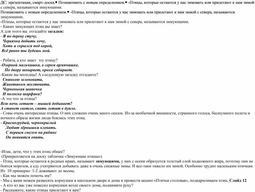 -Итак, дети, что у этих птиц общее? (Прикрепляется на доску табличка «Зимующие птицы») - Птиц, которые остаются в родных краях, называют зимующими, у них с осени образуется толстый слой подкожного жира, поэтому они не боятся морозов, а еду ухитряются добывать даже в очень снежные зимы. И все-таки тяжело им зимой. Особенно трудно маленьким птичкам. Из 10 примерно 1-2 доживают до весны. - Как мы можем помочь им? - Мы с вами можем развесить кормушки в школьном дворе и дома и провести акцию «Птичья столовая», подкармливаем птиц. Слайд 12 - А кто из вас уже повесил кормушки возле своего дома, поднимите руку? - Расскажите, какие птицы прилетают к вам?