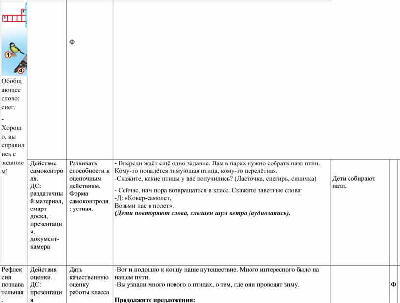 - Впереди ждёт ещё одно задание. Вам в парах нужно собрать пазл птиц. Кому-то попадётся зимующая птица, кому-то перелётная. -Скажите, какие птицы у вас получились? (Ласточка, снегирь, синичка) - Сейчас, нам пора возвращаться в класс. Скажите заветные слова: -Д: «Ковер-самолет, Возьми нас в полет». (Дети повторяют слова, слышен шум ветра (аудиозапись). |