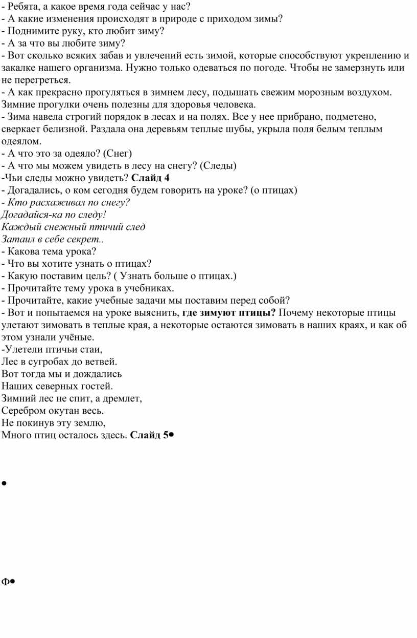 - Ребята, сегодня у нас с вами необычный урок окружающего мира. Сейчас, не покидая нашего класса, мы отправимся в путешествие на волшебном ковре-самолете. Слайд 2 - Внимание! Чтобы ковер-самолет взлетел, надо сказать волшебные слова: «Ковер-самолет, Возьми нас в полет». (Дети повторяют слова, слышен шум ветра (аудиозапись). - Мы летим! Только ветер свистит в ушах. Мы пролетаем над лесом. Сделаем остановку. Слайд 3 - Ребята, а какое время года сейчас у нас? - А какие изменения происходят в природе с приходом зимы? - Поднимите руку, кто любит зиму? - А за что вы любите зиму? - Вот сколько всяких забав и увлечений есть зимой, которые способствуют укреплению и закалке нашего организма. Нужно только одеваться по погоде. Чтобы не замерзнуть или не перегреться. - А как прекрасно прогуляться в зимнем лесу, подышать свежим морозным воздухом. Зимние прогулки очень полезны для здоровья человека. - Зима навела строгий порядок в лесах и на полях. Все у нее прибрано, подметено, сверкает белизной. Раздала она деревьям теплые шубы, укрыла поля белым теплым одеялом. - А что это за одеяло? (Снег) - А что мы можем увидеть в лесу на снегу? (Следы) -Чьи следы можно увидеть? Слайд 4 - Догадались, о ком сегодня будем говорить на уроке? (о птицах) - Кто расхаживал по снегу? Догадайся-ка по следу! Каждый снежный птичий след Затаил в себе секрет.. - Какова тема урока? - Что вы хотите узнать о птицах? - Какую поставим цель? ( Узнать больше о птицах.) - Прочитайте тему урока в учебниках. - Прочитайте, какие учебные задачи мы поставим перед собой? - Вот и попытаемся на уроке выяснить, где зимуют птицы? Почему некоторые птицы улетают зимовать в теплые края, а некоторые остаются зимовать в наших краях, и как об этом узнали учёные. -Улетели птичьи стаи, |