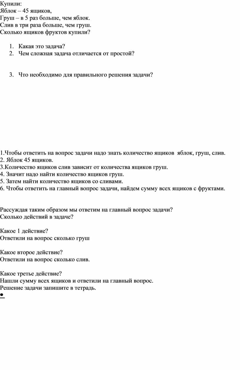 1.Чтобы ответить на вопрос задачи надо знать количество ящиков яблок, груш, слив. 2. Яблок 45 ящиков. 3.Количество ящиков слив зависит от количества ящиков груш. 4. Значит надо найти количество ящиков груш. 5. Затем найти количество ящиков со сливами. 6. Чтобы ответить на главный вопрос задачи, найдем сумму всех ящиков с фруктами.