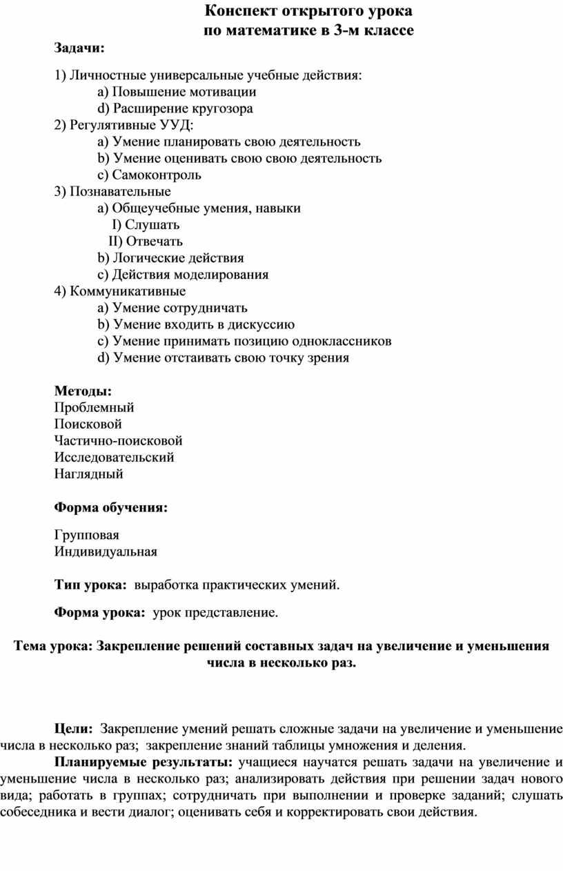 Планируемые результаты: учащиеся научатся решать задачи на увеличение и уменьшение числа в несколько раз; анализировать действия при решении задач нового вида; работать в группах; сотрудничать при выполнении и проверке заданий; слушать собеседника и вести диалог; оценивать себя и корректировать свои действия.