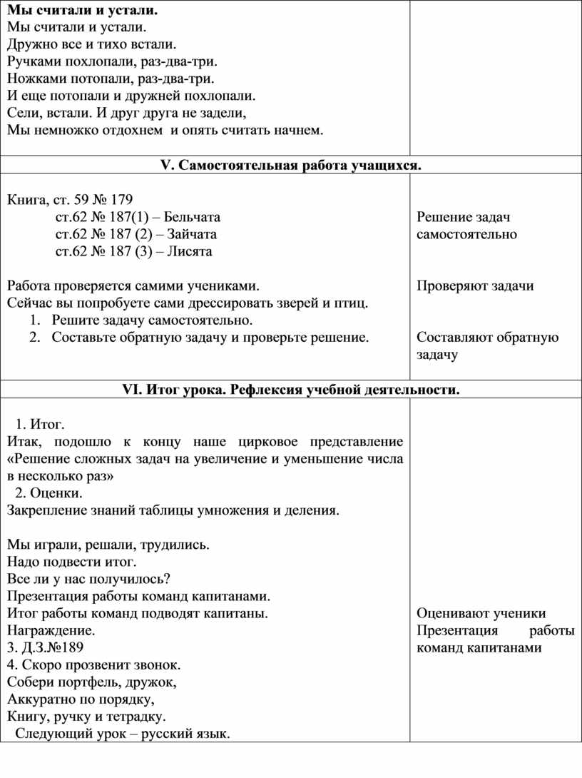 Мы играли, решали, трудились. Надо подвести итог. Все ли у нас получилось? Презентация работы команд капитанами. Итог работы команд подводят капитаны. Награждение. 3. Д.З.№189 4. Скоро прозвенит звонок. Собери портфель, дружок, Аккуратно по порядку, Книгу, ручку и тетрадку. Следующий урок – русский язык. |