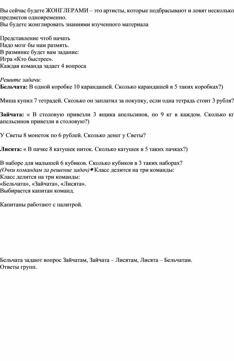 Класс делится на три команды: «Бельчата», «Зайчата», «Лисята». Выбирается капитан команд.