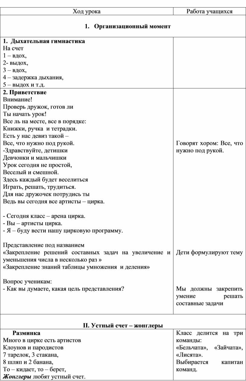 2. Приветствие Внимание! Проверь дружок, готов ли Ты начать урок! Все ль на месте, все в порядке: Книжки, ручка и тетрадки. Есть у нас девиз такой – Все, что нужно под рукой. -Здравствуйте, детишки Девчонки и мальчишки Урок сегодня не простой, Веселый и смешной. Здесь каждый будет веселиться Играть, решать, трудиться. Для нас дружочек потрудись ты Ведь вы сегодня все артисты – цирка.