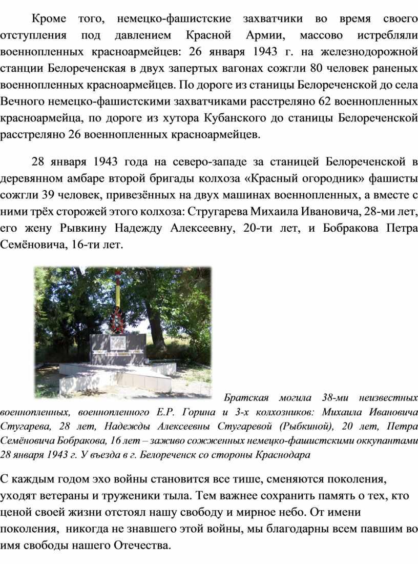 Кроме того, немецко-фашистские захватчики во время своего отступления под давлением Красной Армии, массово истребляли военнопленных красноармейцев: 26 января 1943 г. на железнодорожной станции Белореченская в двух запертых вагонах сожгли 80 человек раненых военнопленных красноармейцев. По дороге из станицы Белореченской до села Вечного немецко-фашистскими захватчиками расстреляно 62 военнопленных красноармейца, по дороге из хутора Кубанского до станицы Белореченской расстреляно 26 военнопленных красноармейцев.