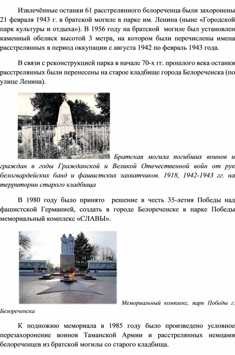 В связи с реконструкцией парка в начале 70-х гг. прошлого века останки расстрелянных были перенесены на старое кладбище города Белореченска (по улице Ленина).