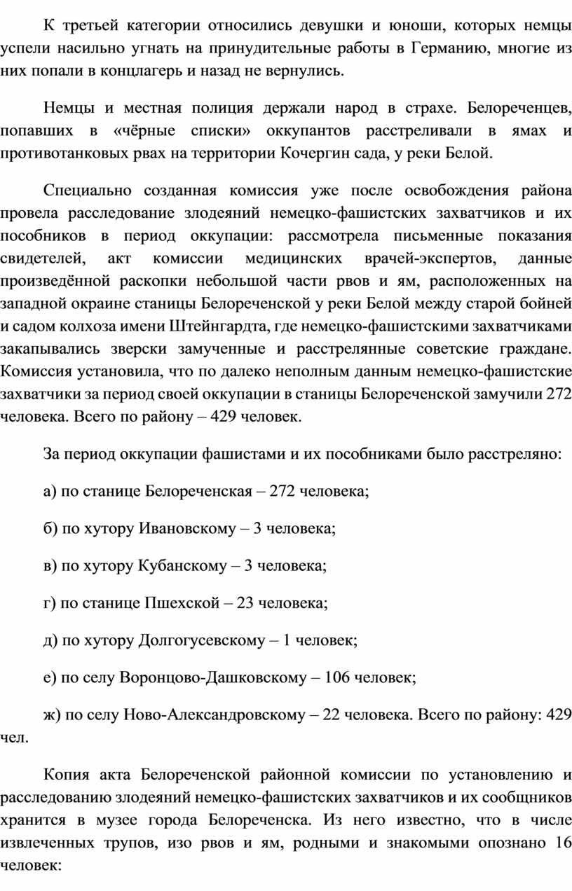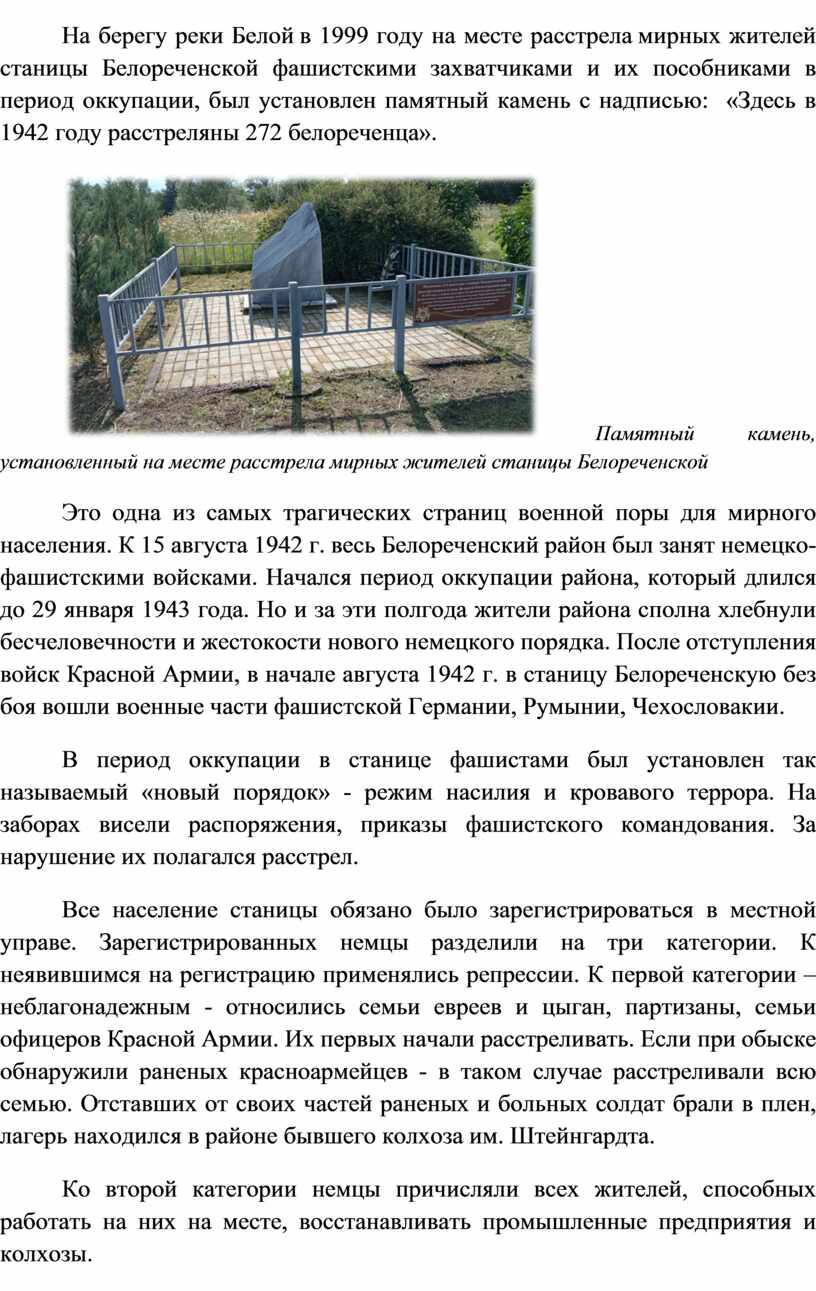 Это одна из самых трагических страниц военной поры для мирного населения. К 15 августа 1942 г. весь Белореченский район был занят немецко-фашистскими войсками. Начался период оккупации района, который длился до 29 января 1943 года. Но и за эти полгода жители района сполна хлебнули бесчеловечности и жестокости нового немецкого порядка. После отступления войск Красной Армии, в начале августа 1942 г. в станицу Белореченскую без боя вошли военные части фашистской Германии, Румынии, Чехословакии.