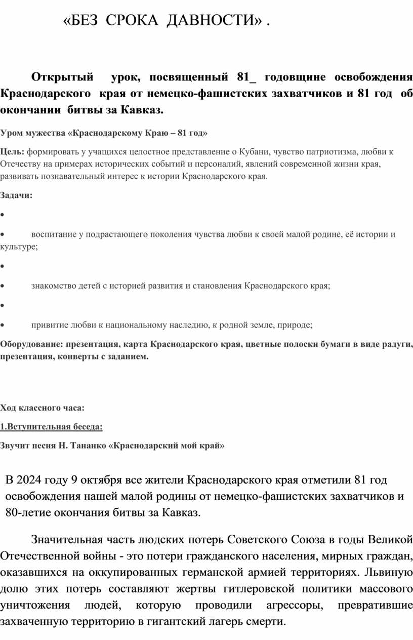Открытый урок, посвященный 81_ годовщине освобождения Краснодарского края от немецко-фашистских захватчиков и 81 год об окончании битвы за Кавказ.
