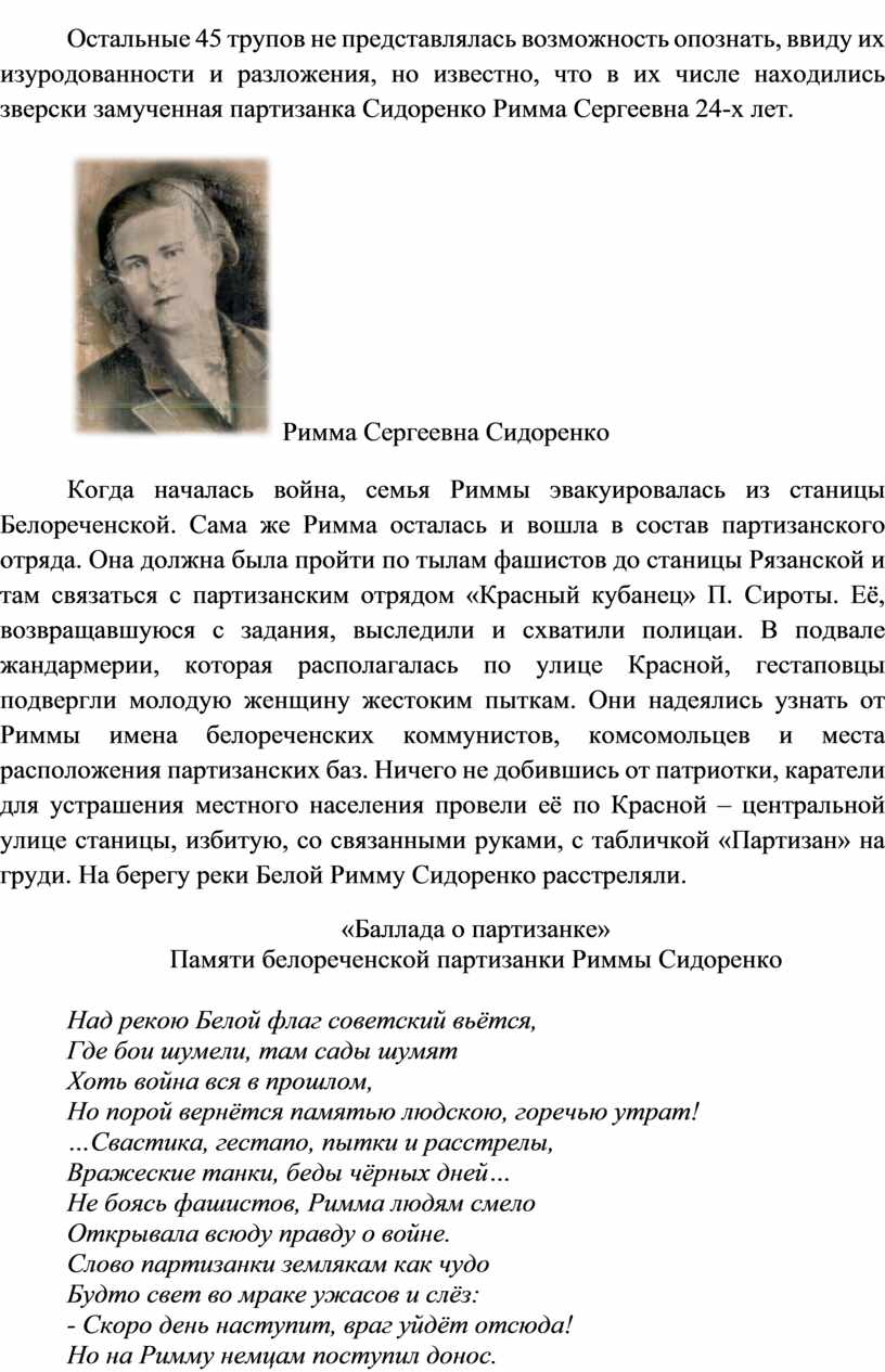 Остальные 45 трупов не представлялась возможность опознать, ввиду их изуродованности и разложения, но известно, что в их числе находились зверски замученная партизанка Сидоренко Римма Сергеевна 24-х лет.