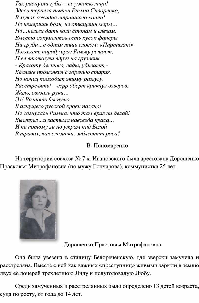 На территории совхоза № 7 х. Ивановского была арестована Дорошенко Прасковья Митрофановна (по мужу Гончарова), коммунистка 25 лет.