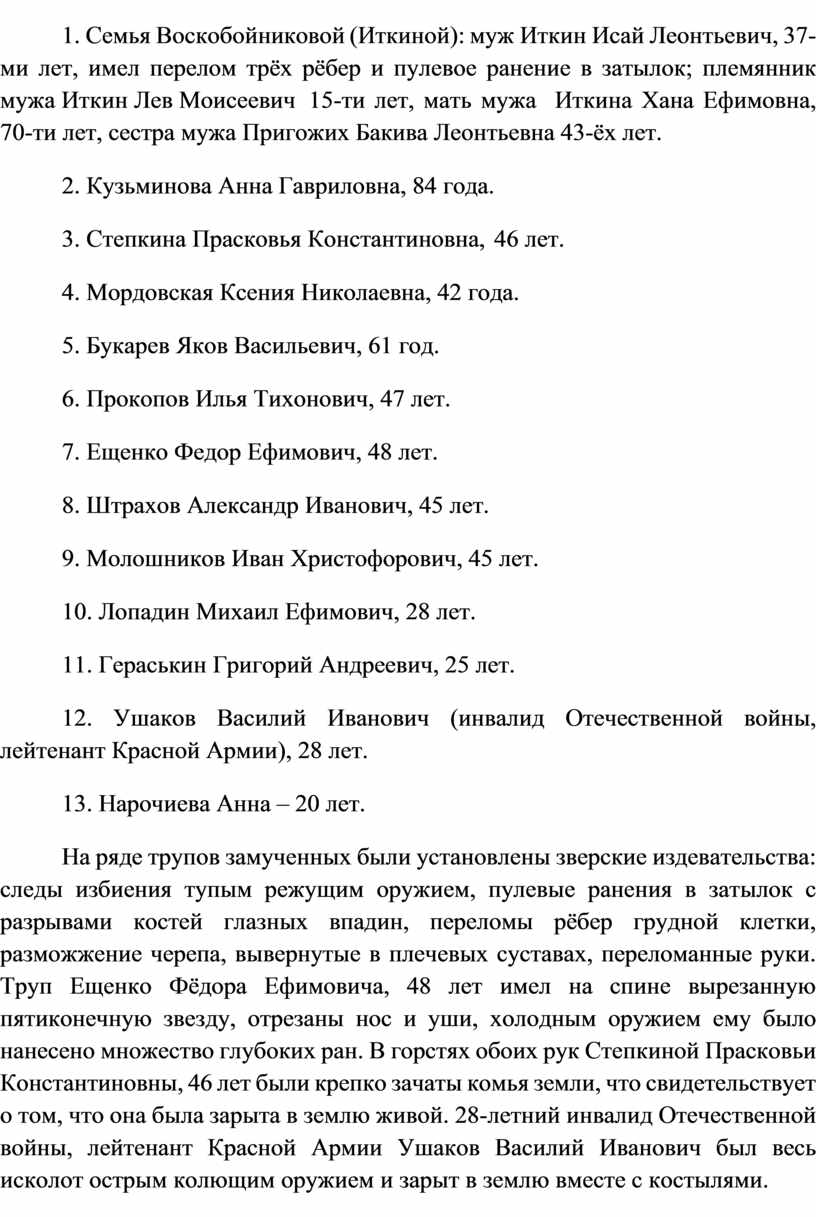 1. Семья Воскобойниковой (Иткиной): муж Иткин Исай Леонтьевич, 37-ми лет, имел перелом трёх рёбер и пулевое ранение в затылок; племянник мужа Иткин Лев Моисеевич 15-ти лет, мать мужа Иткина Хана Ефимовна, 70-ти лет, сестра мужа Пригожих Бакива Леонтьевна 43-ёх лет.