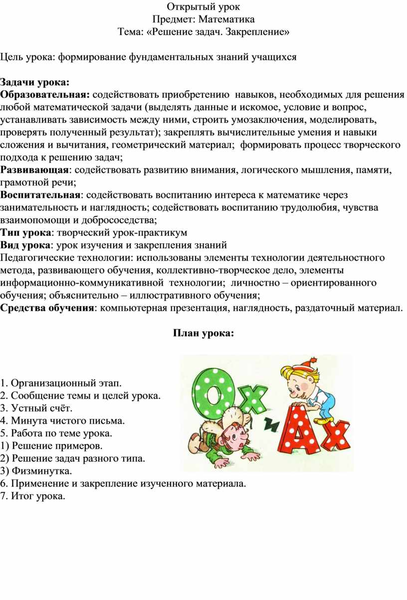 Учитель: Ребята, я считаю, мы должны помочь Оху. Сегодня мы будем решать задачи, тем более что тема нашего урока Слайд № 4 «Решение задач. Закрепление» и покажем, какое это интересное, а для многих вас и любимое дело. Правда? А Ох и Ах будут принимать участие в работе на уроке.