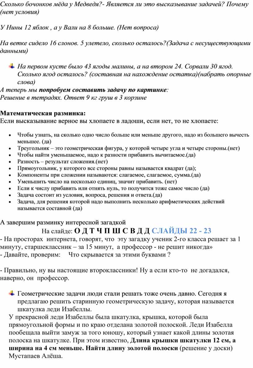 Сколько бочонков мёда у Медведя?- Является ли это высказывание задачей? Почему (нет условия)