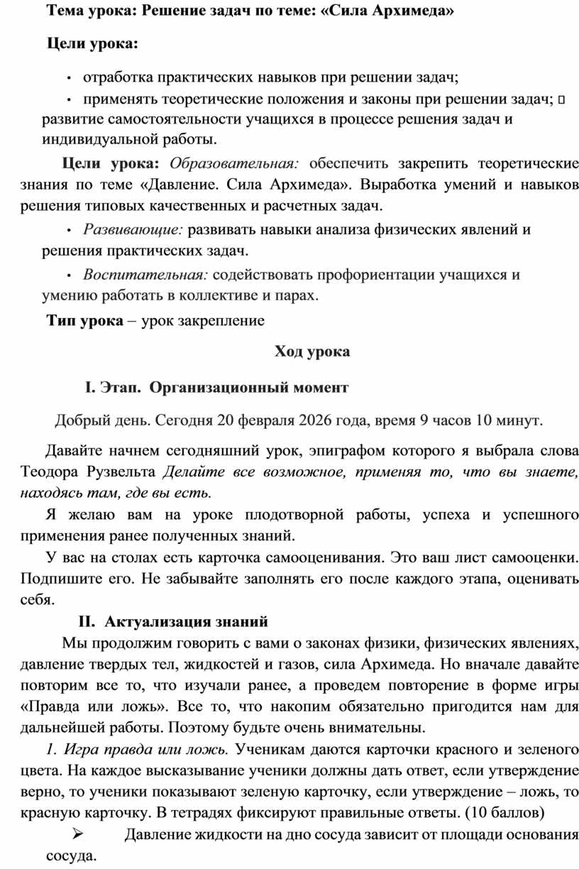 Цели урока: Образовательная: обеспечить закрепить теоретические знания по теме «Давление. Сила Архимеда». Выработка умений и навыков решения типовых качественных и расчетных задач.