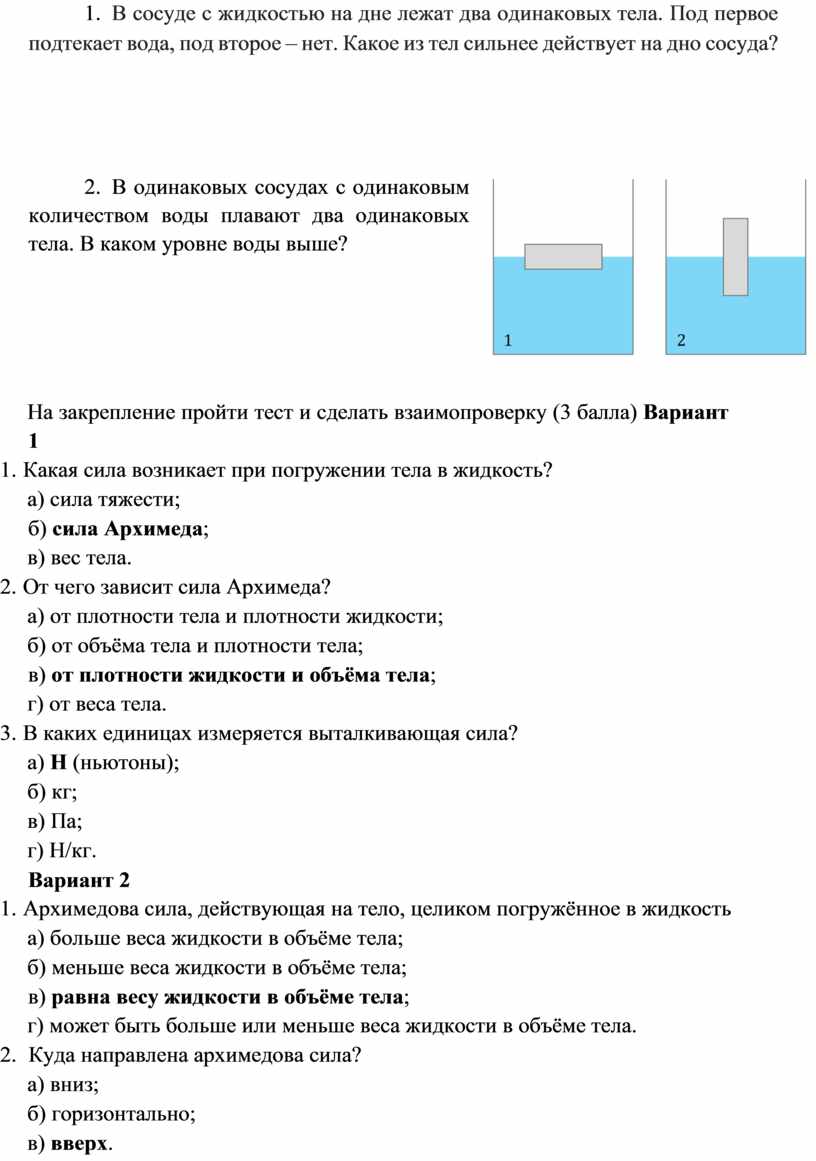 2. В сосуде с жидкостью на дне лежат два одинаковых тела. Под первое подтекает вода, под второе – нет. Какое из тел сильнее действует на дно сосуда?