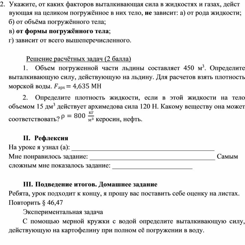 3. Укажите, от каких факторов выталкивающая сила в жидкостях и газах, дейст вующая на целиком погружённое в них тело, не зависит: а) от рода жидкости;