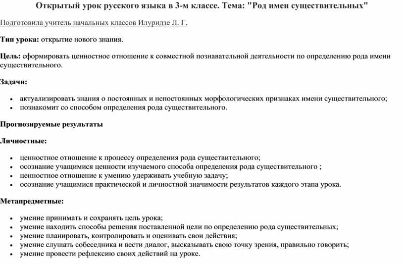 Открытый урок русского языка в 3-м классе. Тема: "Род имен существительных"