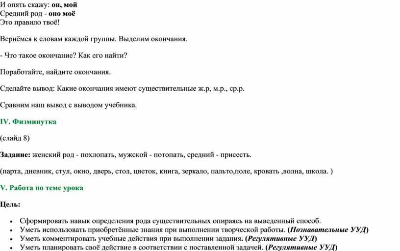 Уметь определять род имён существительных и обосновывать своё мнение. (Познавательные УУД)