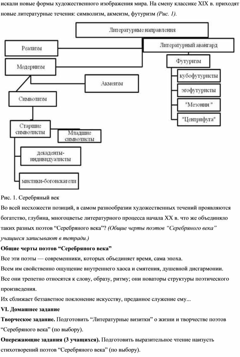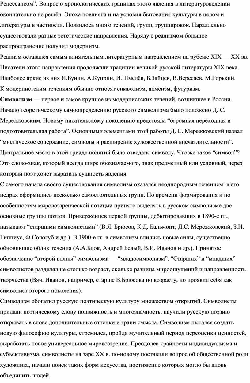 Общим у художников и мыслителей было ощущение начала новой эпохи в развитии человечества... Сегодня “Серебряным веком” русской культуры называют исторически непродолжительный период на рубеже XIX — XX вв., отмеченный необыкновенным творческим подъёмом в поэзии, гуманитарных наук, живописи, музыки, театра. Впервые это название было предложено Н. А. Бердяевым. Ещё этот период называют “русским Ренессансом”. Вопрос о хронологических границах этого явления в литературоведении окончательно не решён. Эпоха повлияла и на условия бытования культуры в целом и литературы в частности. Появилось много течений, групп, группировок. Параллельно существовали разные эстетические направления. Наряду с реализмом большое распространение получил модернизм.