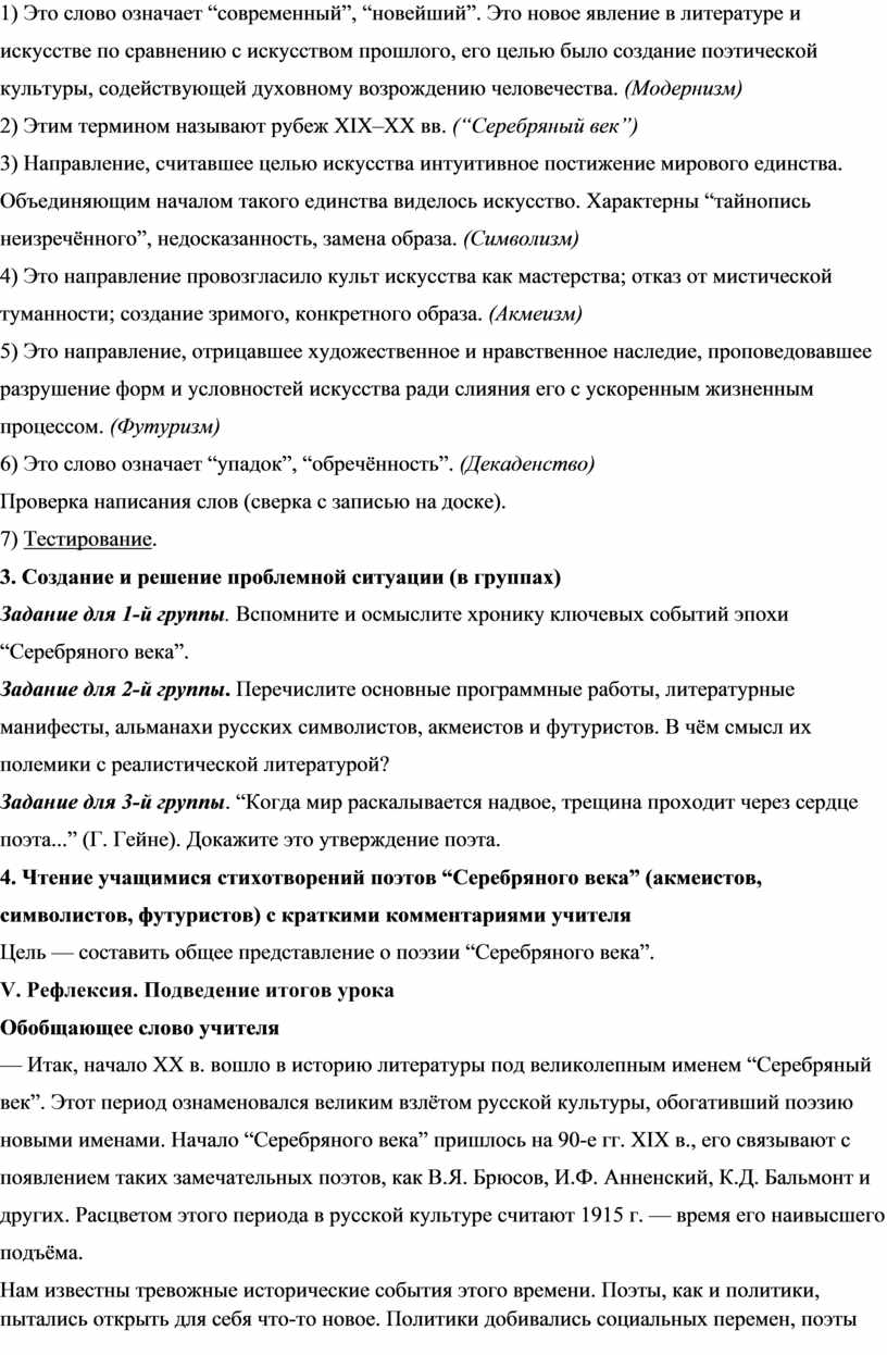 4. Чтение учащимися стихотворений поэтов “Серебряного века” (акмеистов, символистов, футуристов) с краткими комментариями учителя