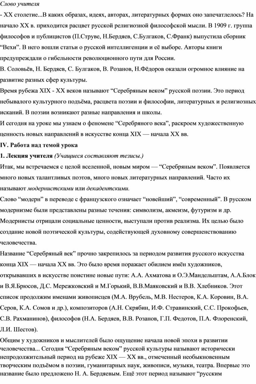 — Итак, начало XX в. вошло в историю литературы под великолепным именем “Серебряный век”. Этот период ознаменовался великим взлётом русской культуры, обогативший поэзию новыми именами. Начало “Серебряного века” пришлось на 90-е гг. XIX в., его связывают с появлением таких замечательных поэтов, как В.Я. Брюсов, И.Ф. Анненский, К.Д. Бальмонт и других. Расцветом этого периода в русской культуре считают 1915 г. — время его наивысшего подъёма.