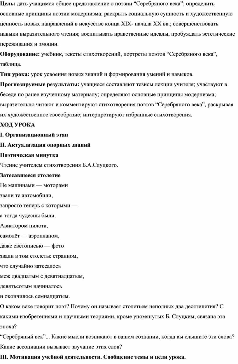 Прогнозируемые результаты: учащиеся составляют тезисы лекции учителя; участвуют в беседе по ранее изученному материалу; определяют основные принципы модернизма; выразительно читают и комментируют стихотворения поэтов “Серебряного века”, раскрывая их художественное своеобразие; интерпретируют избранные стихотворения.
