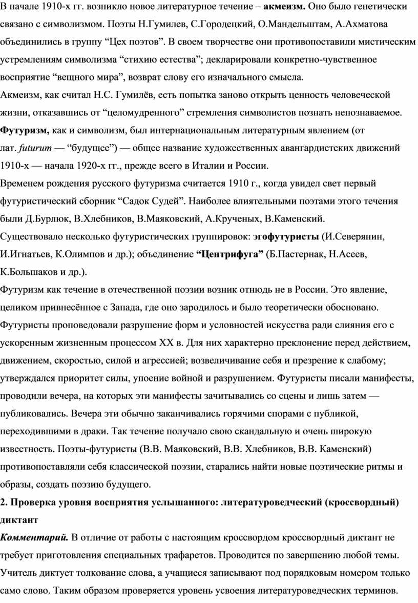 Комментарий. В отличие от работы с настоящим кроссвордом кроссвордный диктант не требует приготовления специальных трафаретов. Проводится по завершению любой темы. Учитель диктует толкование слова, а учащиеся записывают под порядковым номером только само слово. Таким образом проверяется уровень усвоения литературоведческих терминов.