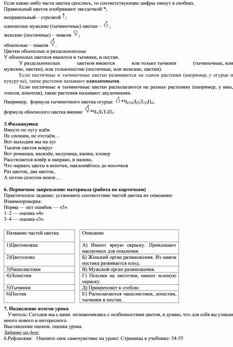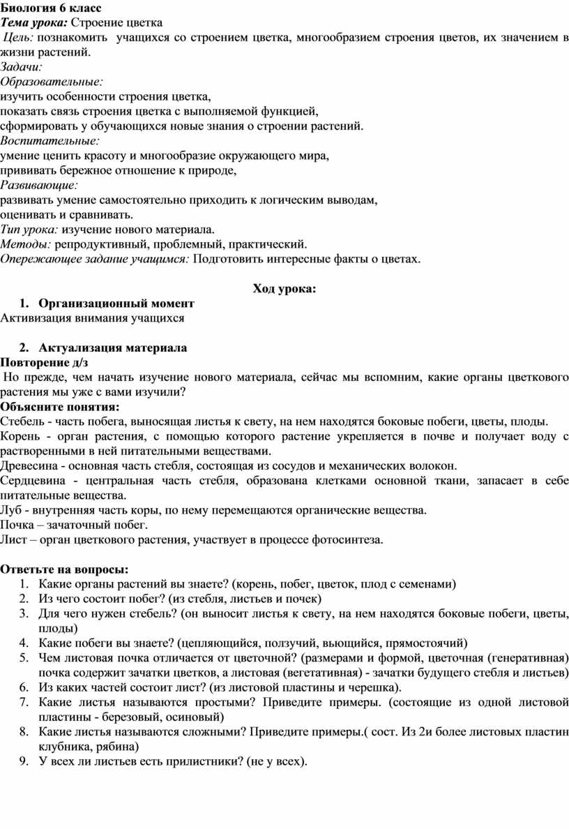 Цель: познакомить учащихся со строением цветка, многообразием строения цветов, их значением в жизни растений.