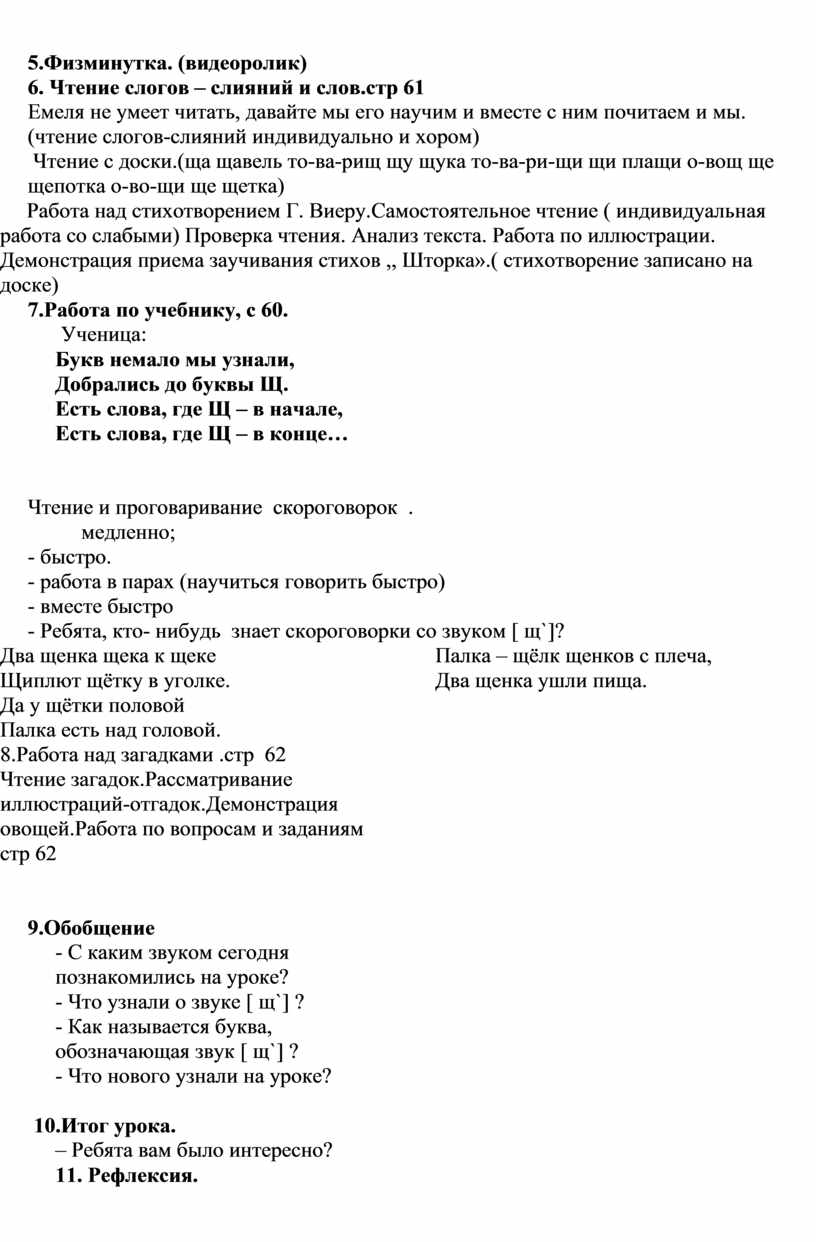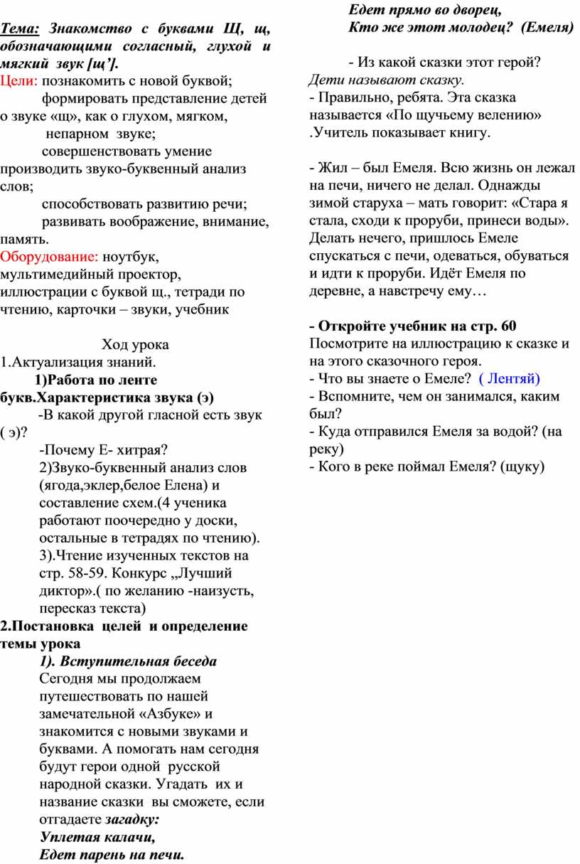 Цель: познакомить учащихся с мягким согласным звуком Щ