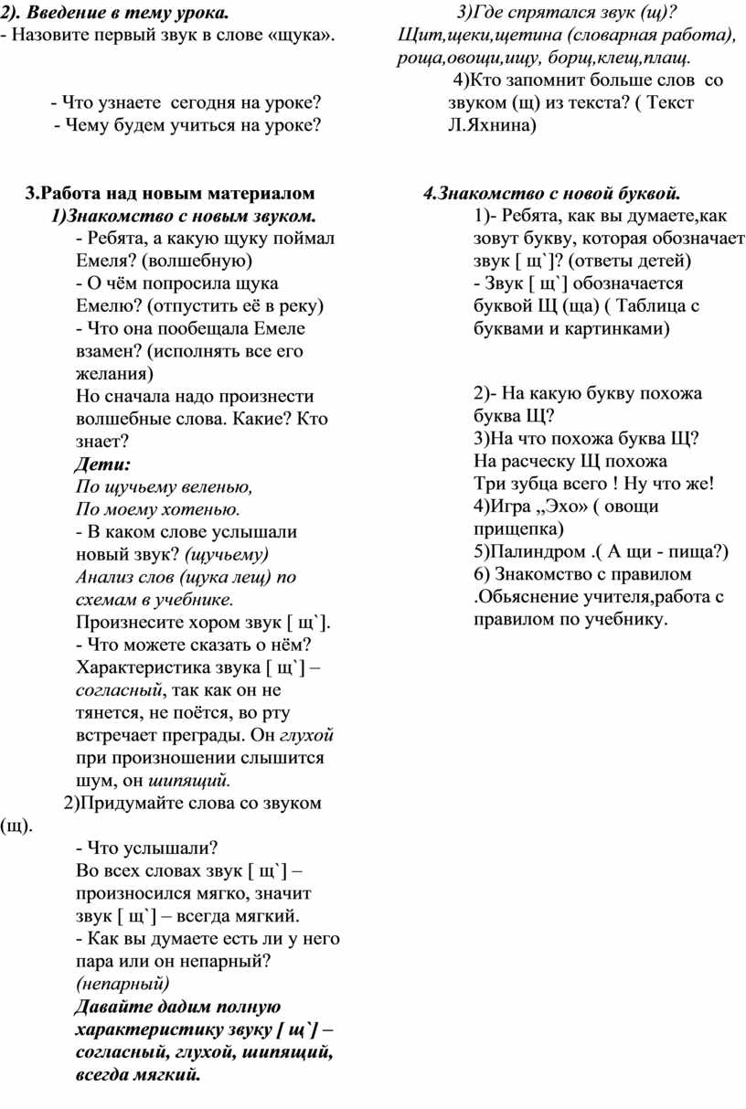 Тема: Знакомство с буквами Щ, щ, обозначающими согласный, глухой и мягкий звук [щ’].