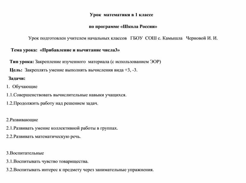 выполнять сложение и вычитание числа 3; решать простые задачи на сложение и вычитание.