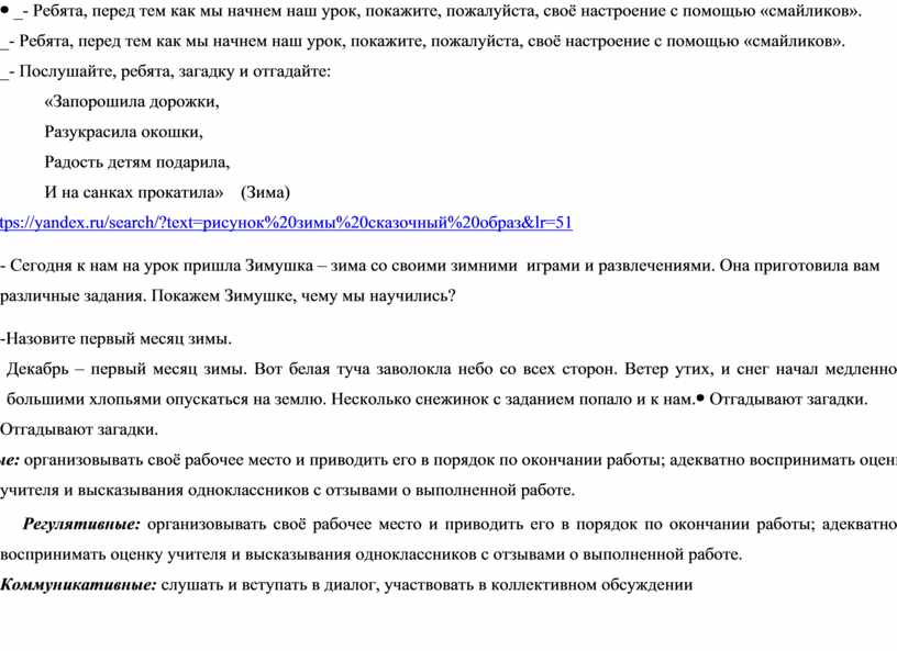 _- Ребята, перед тем как мы начнем наш урок, покажите, пожалуйста, своё настроение с помощью «смайликов». _- Послушайте, ребята, загадку и отгадайте: «Запорошила дорожки, Разукрасила окошки, Радость детям подарила, И на санках прокатила» (Зима) https://yandex.ru/search/?text=рисунок%20зимы%20сказочный%20образ&lr=51 - Сегодня к нам на урок пришла Зимушка – зима со своими зимними играми и развлечениями. Она приготовила вам различные задания. Покажем Зимушке, чему мы научились? -Назовите первый месяц зимы. Декабрь – первый месяц зимы. Вот белая туча заволокла небо со всех сторон. Ветер утих, и снег начал медленно большими хлопьями опускаться на землю. Несколько снежинок с заданием попало и к нам. |