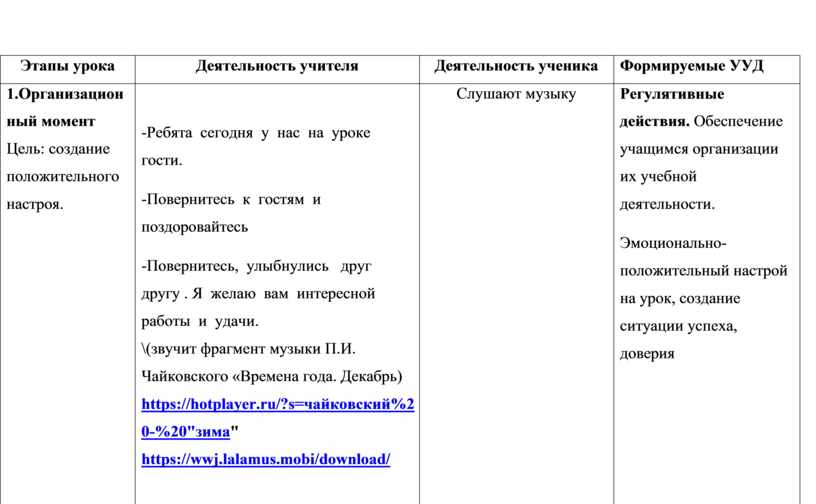 -Ребята сегодня у нас на уроке гости. -Повернитесь к гостям и поздоровайтесь -Повернитесь, улыбнулись друг другу . Я желаю вам интересной работы и удачи. \(звучит фрагмент музыки П.И. Чайковского «Времена года. Декабрь) https://hotplayer.ru/?s=чайковский%20-%20"зима" https://wwj.lalamus.mobi/download/
