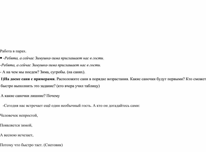 -Ребята, а сейчас Зимушка-зима приглашает нас в гости. - А на чем мы поедем? Зима, сугробы. (на санях). 1)На доске сани с примерами. Расположите сани в порядке возрастания. Какие саночки будут первыми? Кто сможет быстро выполнить это задание? (кто вчера учил таблицу) А какие саночки лишние? Почему -Сегодня нас встречает ещё один необычный гость. А кто он догадайтесь сами: Человечек непростой, Появляется зимой, А весною исчезает, Потому что быстро тает. (Снеговик) https://yandex.ru/search/?clid=9582&text=рисунок%20снеговика&l10n=ru&lr=51 - Снеговик очень просит нас помочь. Снеговик играл в снежки и потерял варежку нам надо помочь снеговику найти варежки для этого надо выполнить задания: Работа по учебнику на с.106 -Сколько желтых флажков повесил Снеговик? (7) - Сколько хочет добавить ещё? (3) -Как это можно сделать? ( ? (3) Вывод: 7+3 =… -Сколько способов прибавления числа 3? (Три) - А какой способ удобнее? (где меньше вычислений) --Сколько ёлочных игрушек у Снеговика? (6) -Как он может повесить эти 3 шарика? - Сколько всего вычитали? Вывод: 6-3=… (записывают в тетрадь) -Сколько способов вычитания числа 3? (Три) - А какой способ удобнее? (где меньше вычислений 2) решить примеры. Вспомним правила работы в парах Решите примеры на листочках и проверьте друг у друга 3+5= 8 6+3=9 7+3=10 9-6=3 8-5=3 10-7=3 4+3=7 2+3= 5 1+3=4