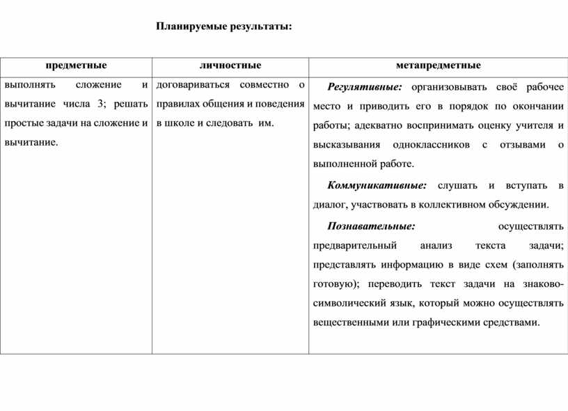 Предметные: выполнять сложение и вычитание числа 3; решать простые задачи на сложение и вычитание. Коммуникативные действия: сотрудничество с учителем и детьми, высказывание своего мнения.