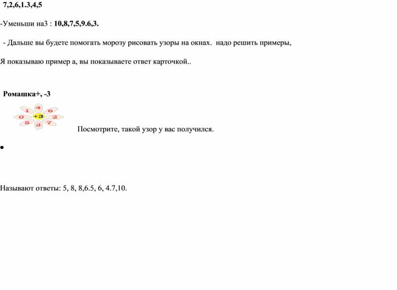 Задание снежинки https://yandex.ru/search/?text=рисунок%20снежинок&lr=51 . Назвать ответы 1) Назовите число, которое следует за числом 4? 2) За числом 7? 3) Какое число стоит перед числом 9 4) Увеличь 4 на 2. Как ты считал? 5) Уменьши 7 на 2. Как считал? 6) 3 да 3. 7) 6 без 2. 8) Первое слагаемое 6, второе 1. Найдите сумму. 9) Увеличь 7 на 1 и снова на 1 и ещё на 1 - Молодцы! С первым заданием Зимушки вы справились. 2.снежинка Увеличить числа на 3.: 7,2,6,1.3,4,5 -Уменьши на3 : 10,8,7,5,9.6,3. - Дальше вы будете помогать морозу рисовать узоры на окнах. надо решить примеры, Я показываю пример а, вы показываете ответ карточкой..