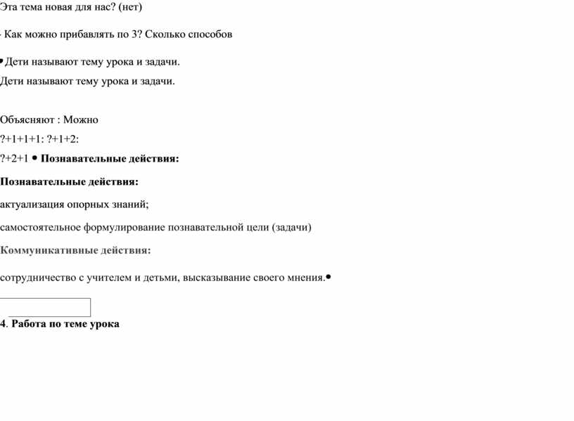 -Как вы думаете, какая тема сегодняшнего урока (Сложение и вычитание числа 3). -Чему будем учиться на уроке? (присчитывать и отсчитывать по 3). Эта тема новая для нас? (нет) К- Как можно прибавлять по 3? Сколько способов