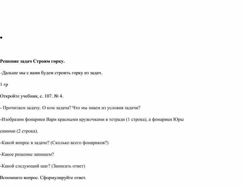 Решение задач Строим горку. -Дальше мы с вами будем строить горку из задач. 1 гр Откройте учебник, с. 107. № 4. - Прочитаем задачу. О ком задача? Что мы знаем из условия задачи? -Изобразим фонарики Вари красными кружочками в тетради (1 строка), а фонарики Юры синими (2 строка). -Какой вопрос в задаче? (Сколько всего фонариков?) -Какое решение запишем? -Какой следующий шаг? (Записать ответ) -Вспомните вопрос. Сформулируйте ответ. Молодцы, половину горки уже построили. 2гр Дальше № 5 Повторили условие и вопрос и решают сам-но. |