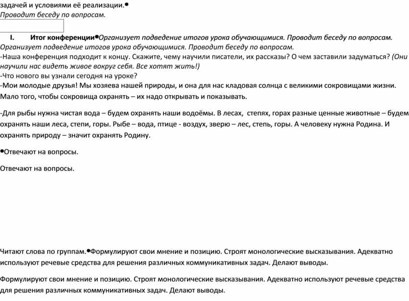 Организует подведение итогов урока обучающимися. Проводит беседу по вопросам. -Наша конференция подходит к концу. Скажите, чему научили писатели, их рассказы? О чем заставили задуматься? (Они научили нас видеть живое вокруг себя. Все хотят жить!) -Что нового вы узнали сегодня на уроке? -Мои молодые друзья! Мы хозяева нашей природы, и она для нас кладовая солнца с великими сокровищами жизни. Мало того, чтобы сокровища охранять – их надо открывать и показывать. -Для рыбы нужна чистая вода – будем охранять наши водоёмы. В лесах, степях, горах разные ценные животные – будем охранять наши леса, степи, горы. Рыбе – вода, птице - воздух, зверю – лес, степь, горы. А человеку нужна Родина. И охранять природу – значит охранять Родину.