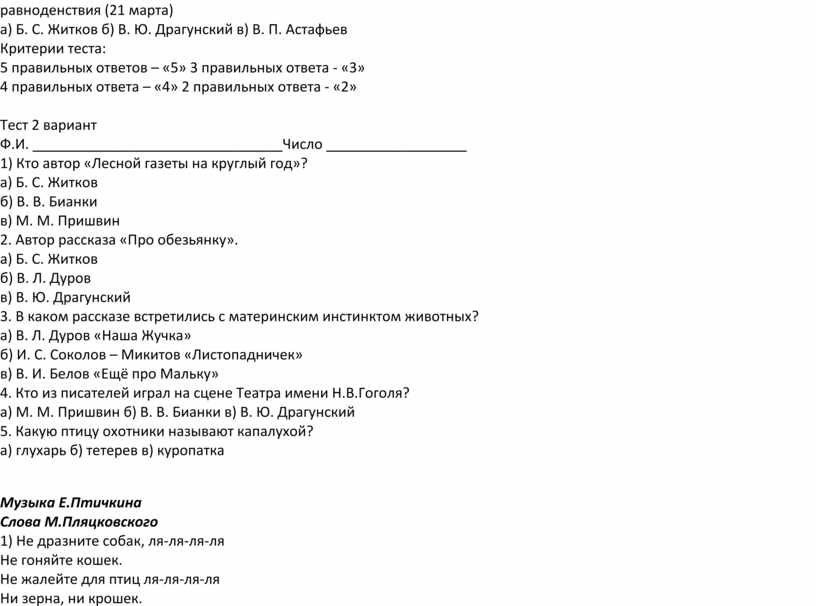 а) М. М. Пришвин б) В. В. Бианки в) В. Ю. Драгунский