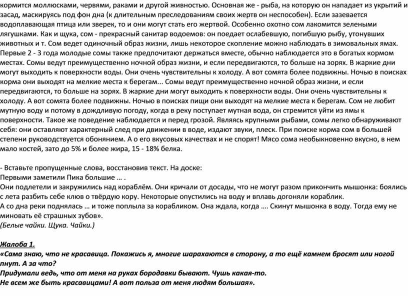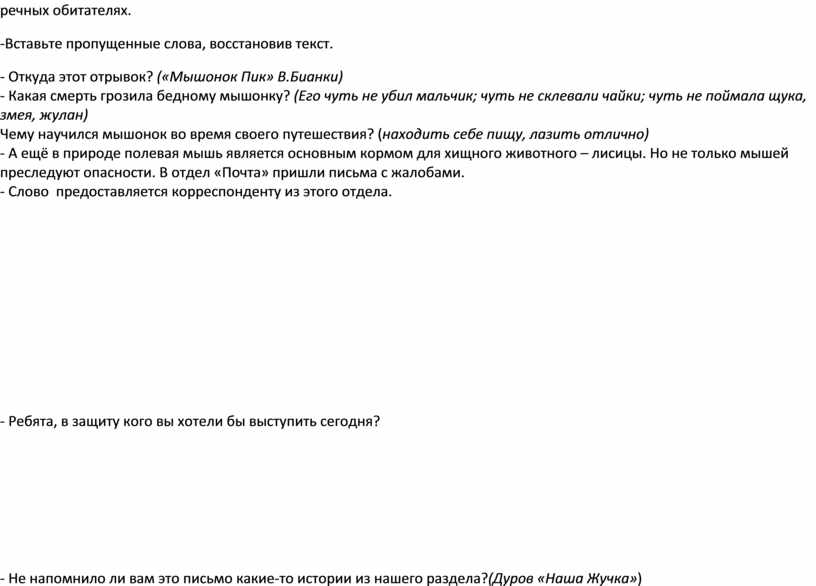 -Слово для выступления предоставляется корреспондентам – представителям отдела «Рыбацкий Узел». -Кто хочет дополнить выступление? Расскажите о речных обитателях. -Вставьте пропущенные слова, восстановив текст. - Откуда этот отрывок? («Мышонок Пик» В.Бианки) - Какая смерть грозила бедному мышонку? (Его чуть не убил мальчик; чуть не склевали чайки; чуть не поймала щука, змея, жулан) Чему научился мышонок во время своего путешествия? (находить себе пищу, лазить отлично) - А ещё в природе полевая мышь является основным кормом для хищного животного – лисицы. Но не только мышей преследуют опасности. В отдел «Почта» пришли письма с жалобами. - Слово предоставляется корреспонденту из этого отдела.