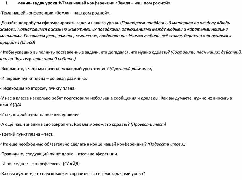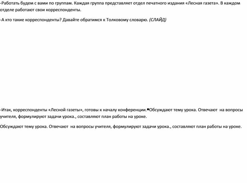 -Тема нашей конференции «Земля – наш дом родной». -Давайте попробуем сформулировать задачи нашего урока. (Повторяем пройденный материал по разделу «Люби живое». Познакомимся с жизнью животных, их повадками, отношениями между людьми и «братьями нашими меньшими. Развиваем речь, память, мышление, воображение. Учимся любить всё живое, бережно относиться к природе.) (Слайд) -Чтобы успешно выполнить поставленные задачи, кто догадался, что нужно сделать? (Составить план наших действий, или по-другому, план нашей работы) -Вспомните, с чего мы начинаем каждый урок чтения? (С речевой разминки) -И первый пункт плана – речевая разминка. -Переходим ко второму пункту плана. -У нас в классе несколько ребят подготовили небольшие сообщения и доклады. Как вы думаете, нужно их вносить в план? (ДА) -Итак, второй пункт плана- выступления -А ещё наши знания надо закрепить. Как мы можем это сделать? (Провести тест) -Третий пункт плана – тест. -Что ещё необходимо обязательно сделать в конце нашей конференции? (Подвести итоги.) -Правильно, следующий пункт плана – итоги конференции. - И последнее – это рефлексия. (СЛАЙД) -Как вы думаете, кто нам поможет справиться со всеми задачами урока? -Да. Помогут нам всё это выполнить авторы литературных произведений, которые вы познакомились в разделе «Люби живое», а также ваши активная работа, внимание, умение слушать своих товарищей. -Работать будем с вами по группам. Каждая группа представляет отдел печатного издания «Лесная газета». В каждом отделе работают свои корреспонденты. -А кто такие корреспонденты? Давайте обратимся к Толковому словарю. (СЛАЙД)