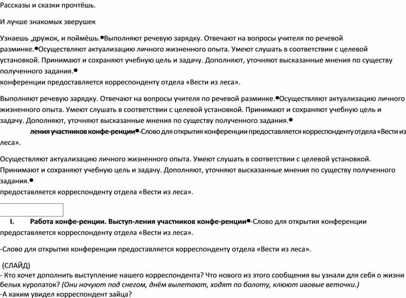 -Слово для открытия конференции предоставляется корреспонденту отдела «Вести из леса». (СЛАЙД) - Кто хочет дополнить выступление нашего корреспондента? Что нового из этого сообщения вы узнали для себя о жизни белых куропаток? (Они ночуют под снегом, днём вылетают, ходят по болоту, клюют ивовые веточки.) -А каким увидел корреспондент зайца? - Расскажите, какие истории вам запомнились о зайчике? (СЛАЙД) Сейчас попробуем дать характеристику зайчику из рассказа Ивана Сергеевича Соколова – Микитова. -Вам было дано задание подготовить пожелания зайчонку на осенних листочках. Самые лучшие мы отправим в нашу газету.