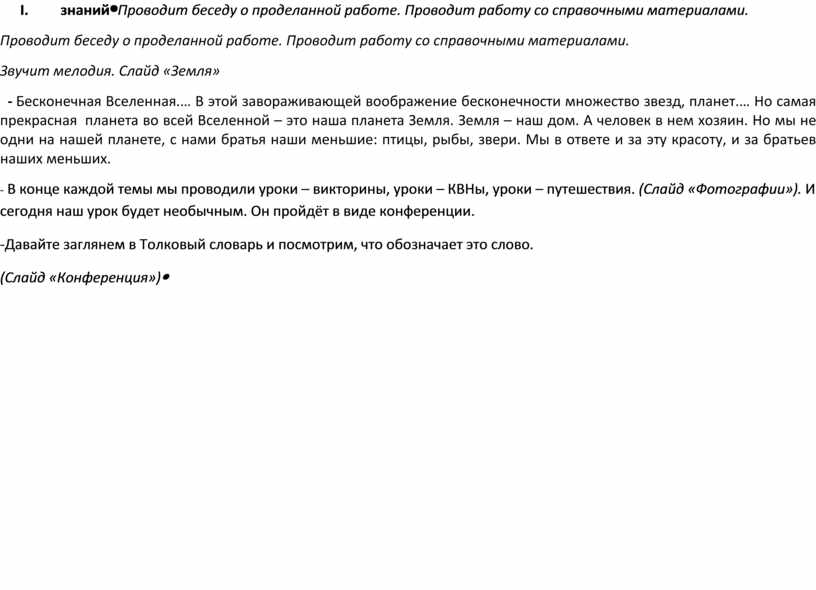 Проводит беседу о проделанной работе. Проводит работу со справочными материалами. Звучит мелодия. Слайд «Земля» - Бесконечная Вселенная.… В этой завораживающей воображение бесконечности множество звезд, планет.… Но самая прекрасная планета во всей Вселенной – это наша планета Земля. Земля – наш дом. А человек в нем хозяин. Но мы не одни на нашей планете, с нами братья наши меньшие: птицы, рыбы, звери. Мы в ответе и за эту красоту, и за братьев наших меньших. - В конце каждой темы мы проводили уроки – викторины, уроки – КВНы, уроки – путешествия. (Слайд «Фотографии»). И сегодня наш урок будет необычным. Он пройдёт в виде конференции. -Давайте заглянем в Толковый словарь и посмотрим, что обозначает это слово. (Слайд «Конференция») |