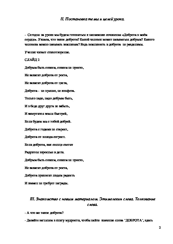 Открытый урок развития речи во 2м классе по теме:«Доброта в моём