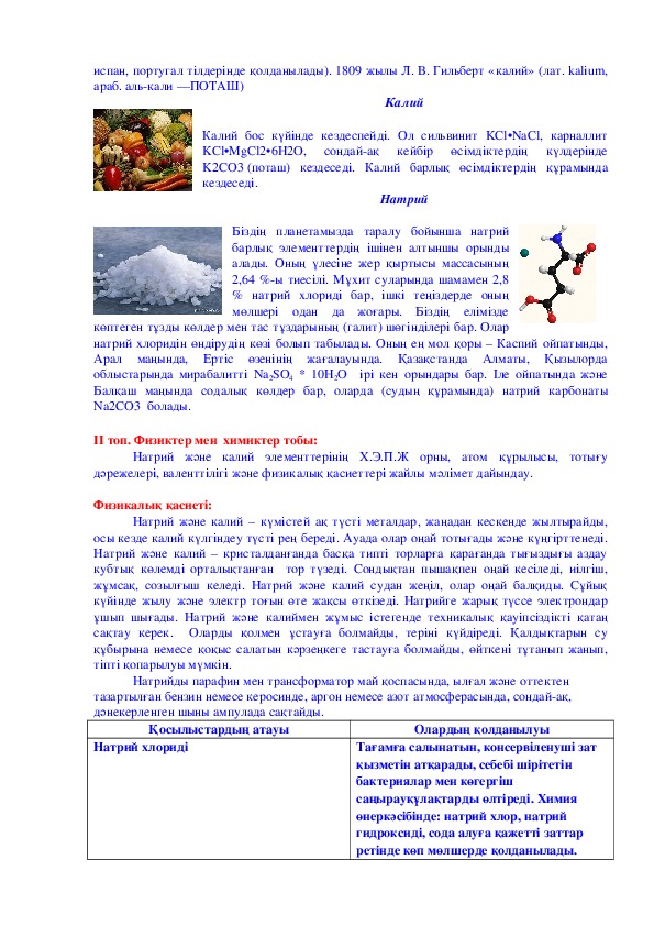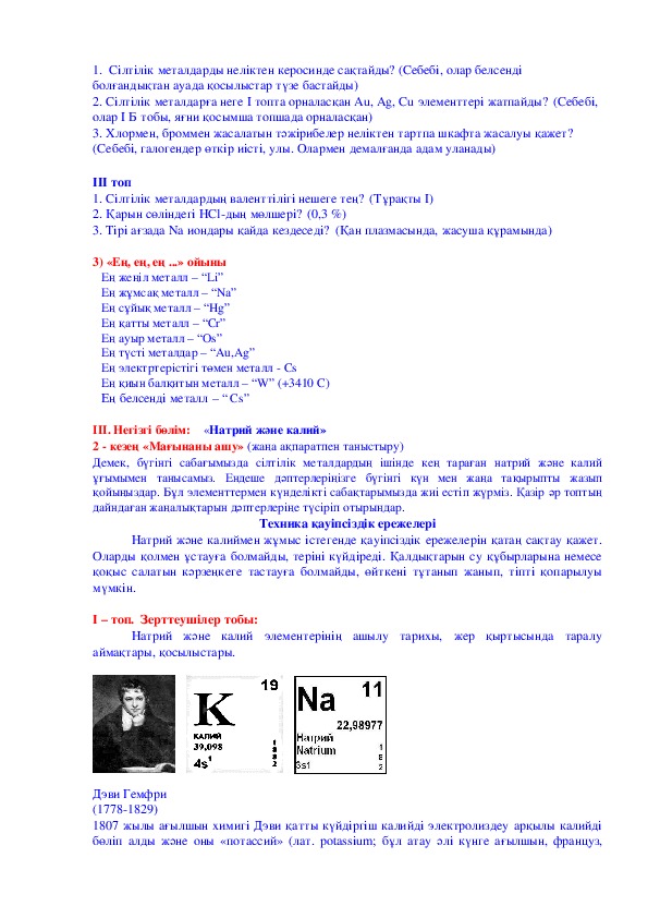 қасиеттері және sэлементтер туралы білімдеріне сүйене отырып, студенттерді натрийдің,
