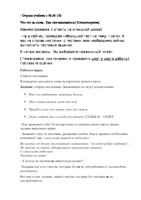 - Ну а сейчас, проведём небольшой тест на тему: глагол. У