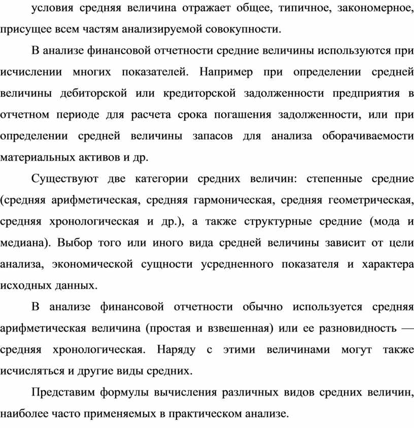 В анализе финансовой отчетности обычно используется средняя арифметическая величина (простая и взвешенная) или ее разновидность — средняя хронологическая. Наряду с этими величинами могут также исчисляться и другие виды средних.